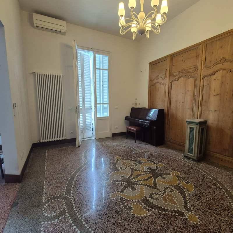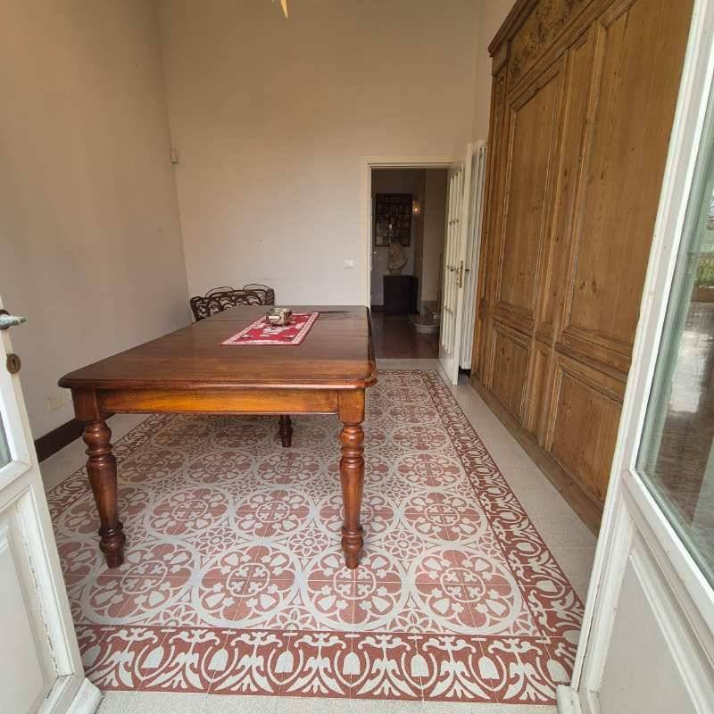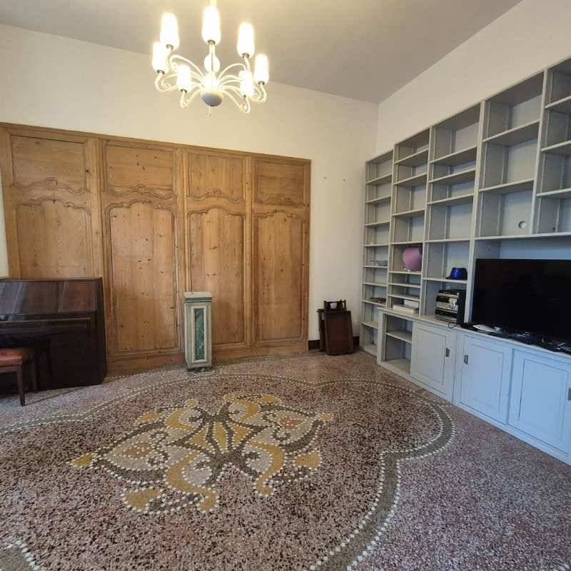 Al piano terra si entra in resede pavimentata fronte strada in cui si può parcheggiare un'auto di medie dimensioni. Il piano terra di mq. 92 è diviso in ingresso, sala soggiorno fronte strada, vano scale-ascensore, sala da pranzo, cucina abitabile, ripostiglio, vano tecnico, pavimenti in graniglia a getto unico, soffitti alti. Sia dalla cucina che dalla sala da pranzo si accede al giardinetto interno in cui troviamo il vano caldaia e accumulatore acqua per presenza sul tetto di pannelli solari, lavanderia.