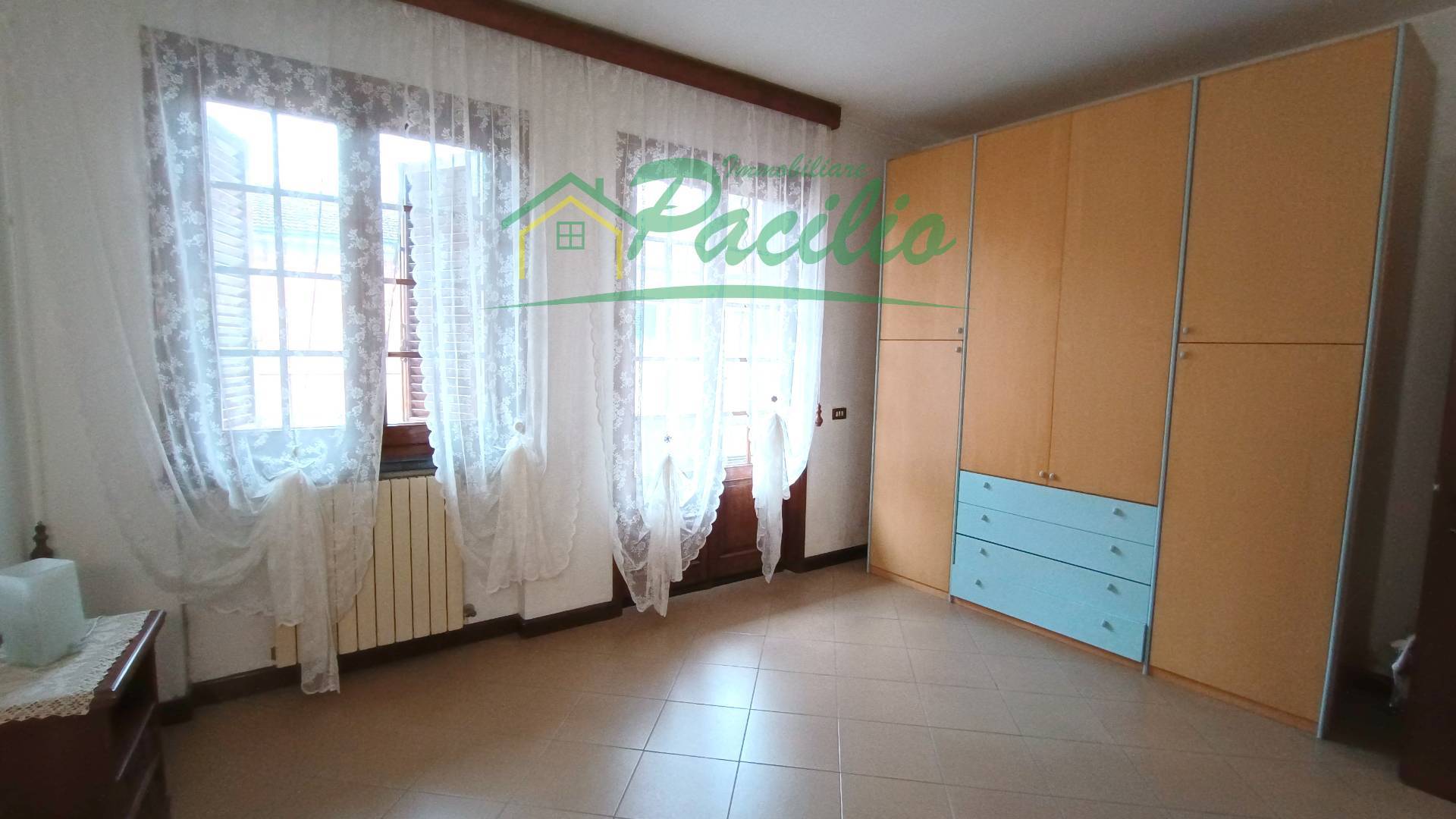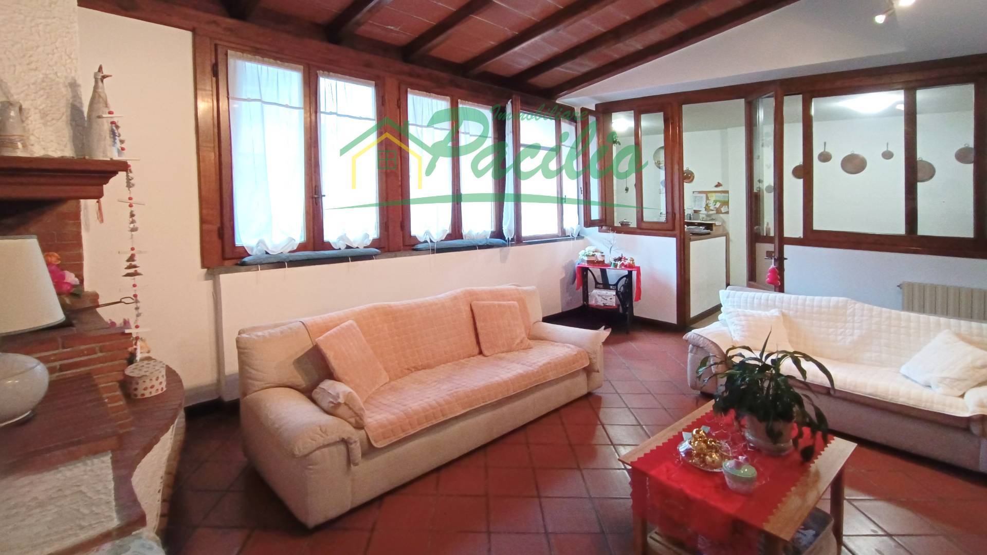 Posto al primo piano e composto da ingresso, sala da pranzo con angolo cottura a vista, ampio soggiorno con camino, due camere matrimoniali, stanza studio, bagno con vasca e finestra, ripostiglio con pilozzo. Balcone. Al piano terra spazio dedicato per riporre le biciclette in comune con l'altra unità che si trova al secondo piano.